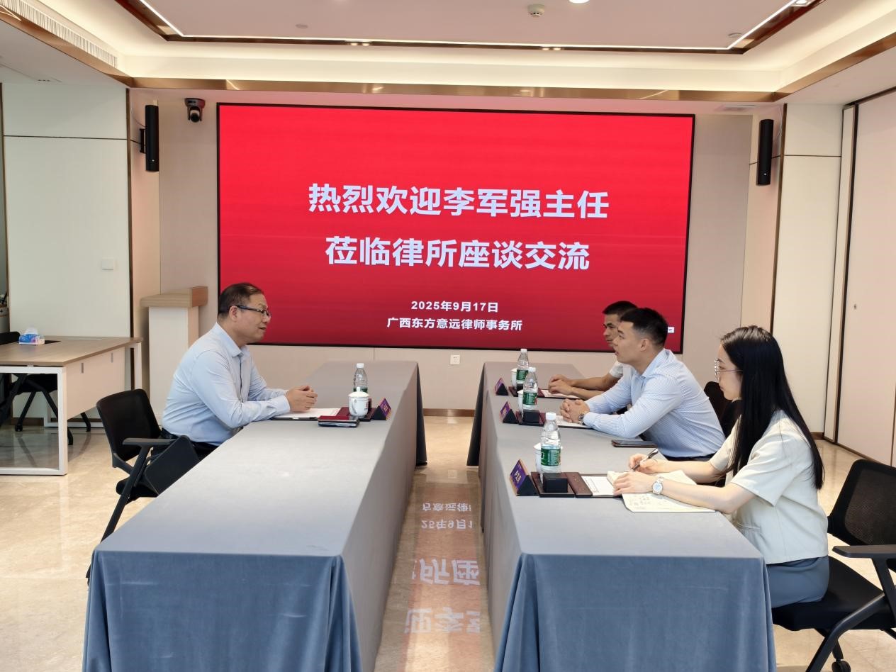 2025年9月17日下午,广东知恒(龙岗)律师事务所主任李军强莅临广西东方意远律师事务所进行参观交流。东方意远党支部书记、管委会主任蒋巍雄,高级合伙人唐恒律师等代表本所热情接待并举行了富有成效的座谈交流会。双方就律所管理、专业化建设、品牌发展及未来合作可能性等议题进行了深入探讨。
